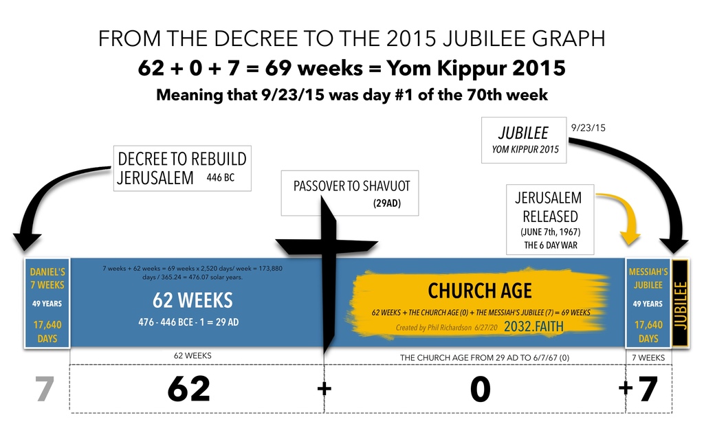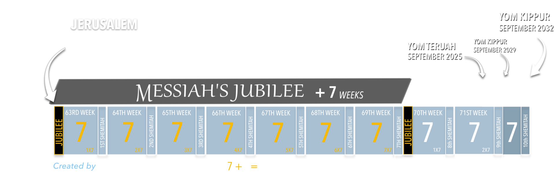 I believe that event initiated the countdown timer. Daniel 9:25 states that there will be “7 weeks and 62 weeks” from the command to restore and rebuild Jerusalem until the Messiah the Prince." Reverse that and you have 62 weeks and 7 weeks. If you count from 62 weeks and add the Messiah's Jubilee of 7 weeks, you now have 69 weeks and thus a countdown to the 70th week. Note on the graph that the 70th and 71st week is listed. There is no indication of a 71st week in scripture, nonetheless, the math works out that way.